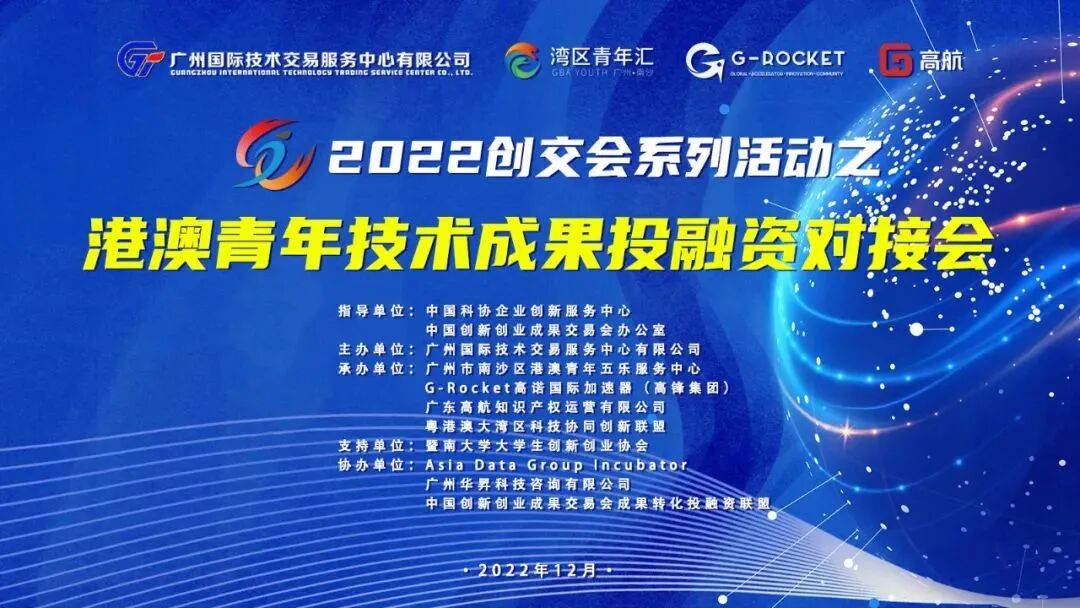 为推动粤港澳大湾区协同创新发展,促进湾区青年科技创新成果交流与合作,结合《广州南沙深化面向世界的粤港澳全面合作总体方案》,助力港澳青年来穗发展,在中国科协企业创新服务中心和中国创新创业成果交易会办公室的指导下,由广州国际技术交易服务中心有限公司联合广州市南沙区港澳青年五乐服务中心、G-Rocket高诺国际加速器(高锋集团)、广东高航知识产权运营有限公司等单位举办的“港澳青年技术成果投融资对接会”拟于2022年12月9日(星期五)下午14:30通过线上直播的形式举办。