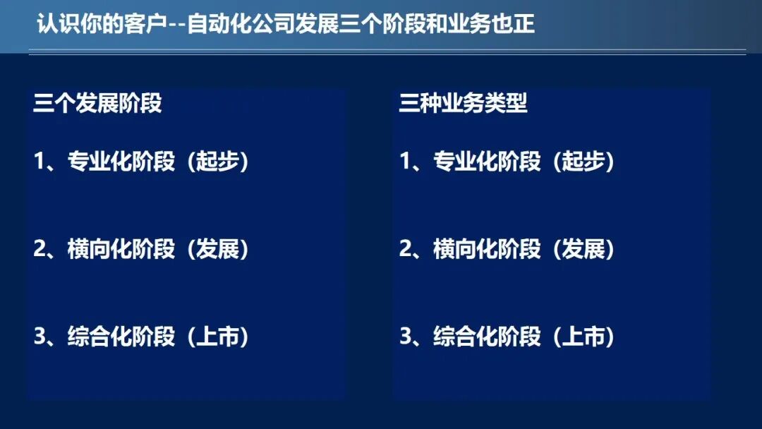 1、专业化阶段(起步):营业额3000万--1亿: 专注于1-2个细分行业,比如汽车行业的座椅自动化;老板直接管理供应商,对于价格比较敏感