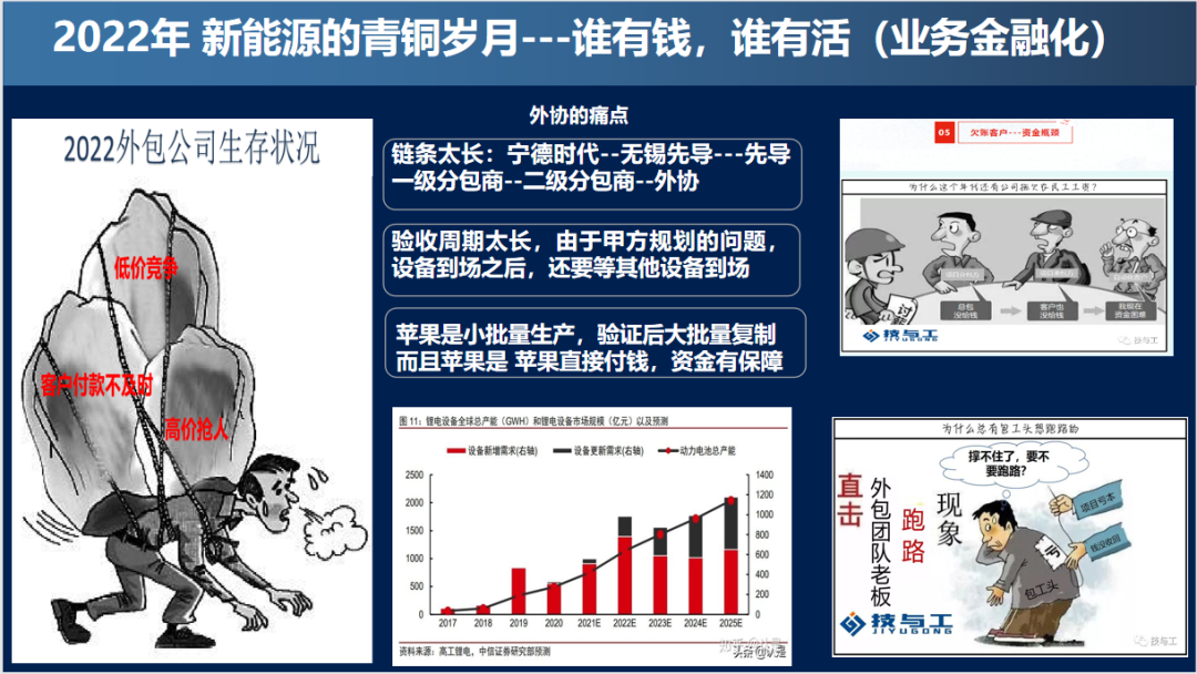 2、代工型企业:代工型企业,公司老板属于做业务或者做供应链管理出身,公司人员中业务人员和项目管理人员较多,代工型的企业接到的很多都不是一手单,很可能是博众、赛腾、先导的二手单,二手单的周期比较长,垫资风险比较大。