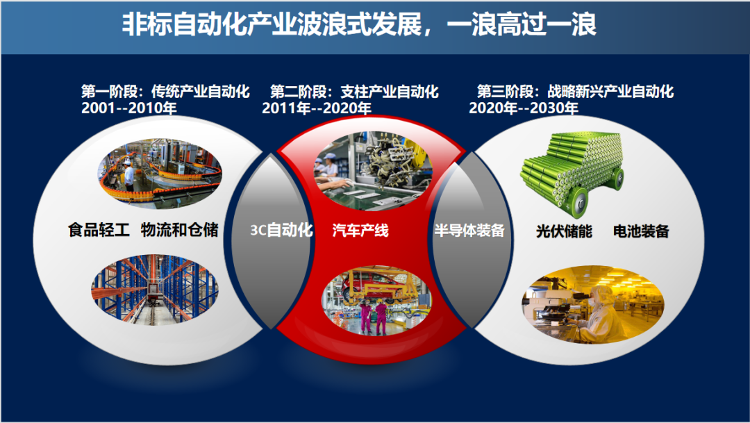 国内,任何一个产业都有行业周期,有高峰,有低谷,但是非标自动化产业不一样,它一直在紧跟当今时代的产业热潮,2001年--2010年,主要时轻工行业自动化和物流仓储自动化;2011年--2020年 主要是3C、汽车 等国内支柱产业的自动化;2021年--2030年,将是战略新兴产业,如光伏、锂电、半导体的自动化....如今非标自动化产业已经是万亿级的产业,涌现出65家上市公司