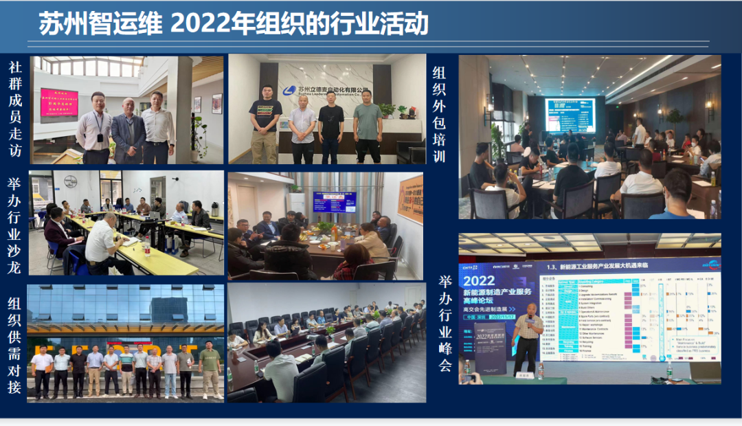 苏州智运维2022年在智能装备行业组织过多场行业活动:包括社群成员走访;举办行业沙龙;组织供需见面;组织外包培训;举办产业峰会......今后也希望跟大家共同研讨这个话题:装备制造外包服务,如何做大做强?