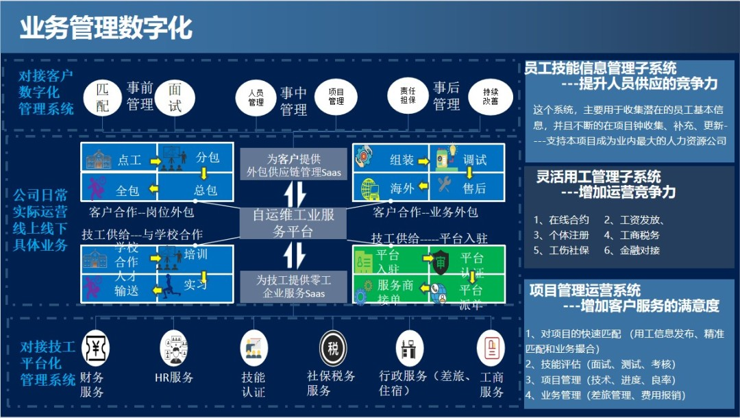 趋势之三:数字化,外包服务行业存在“鱼龙混杂”“小弱散差”的典型特征,要做大做强,就必须走向 标准化,标准化就需要数字化来进行助攻;装备制造服务业,是非常适合用数字化来进行提升效率的。