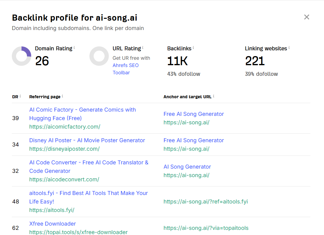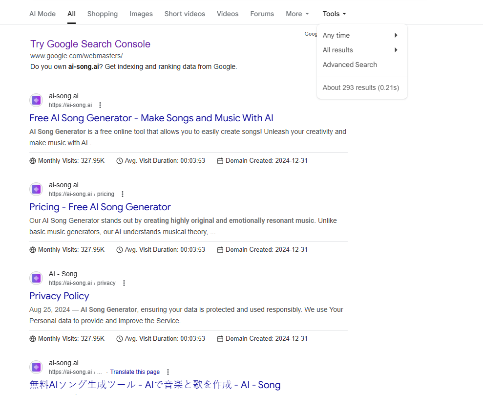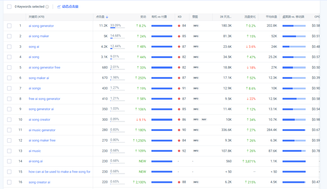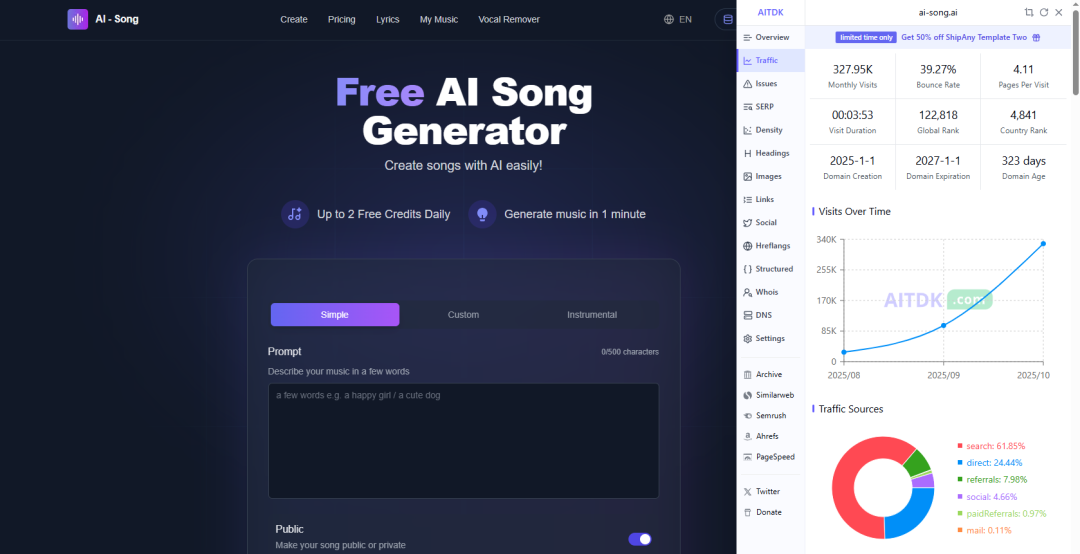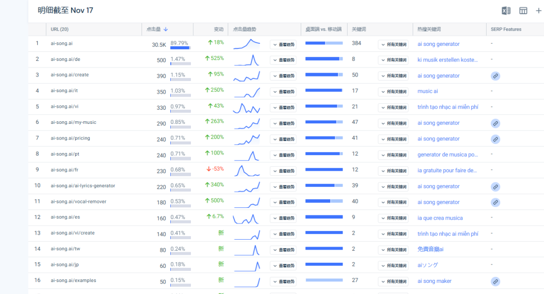 Ai song generatro这个词一个月给网站带来了11.2K的点击,然后是ai song maker, song ai ,ai song, ai song generator free. 再来看下它的落地页: