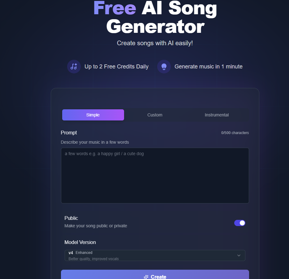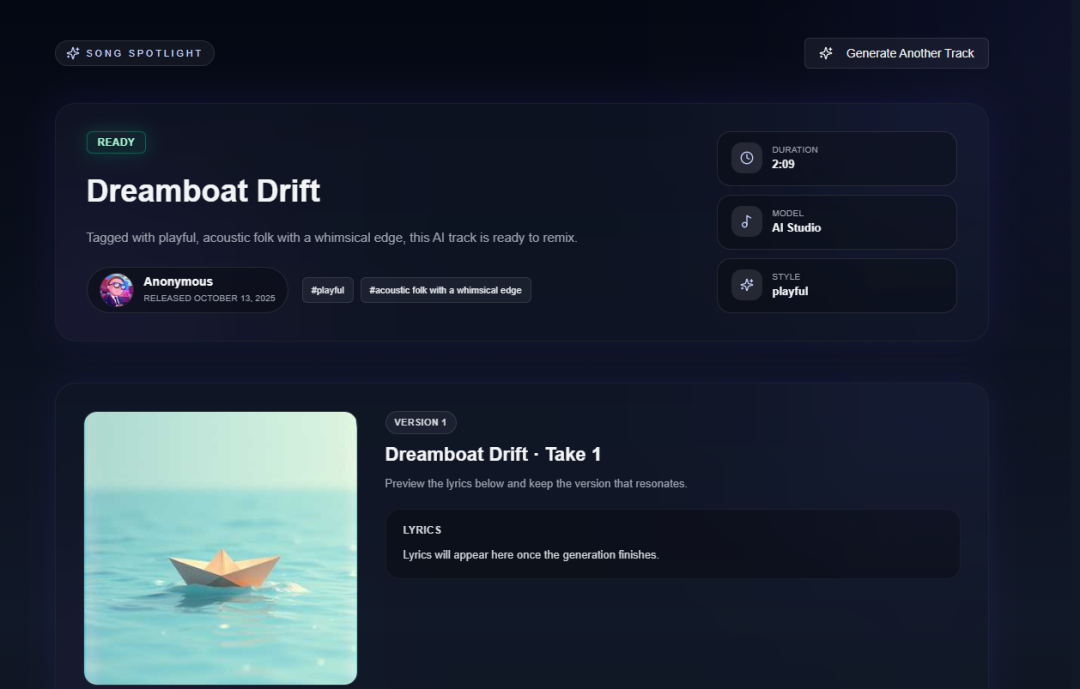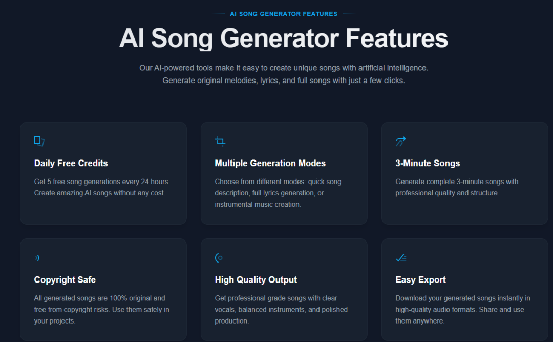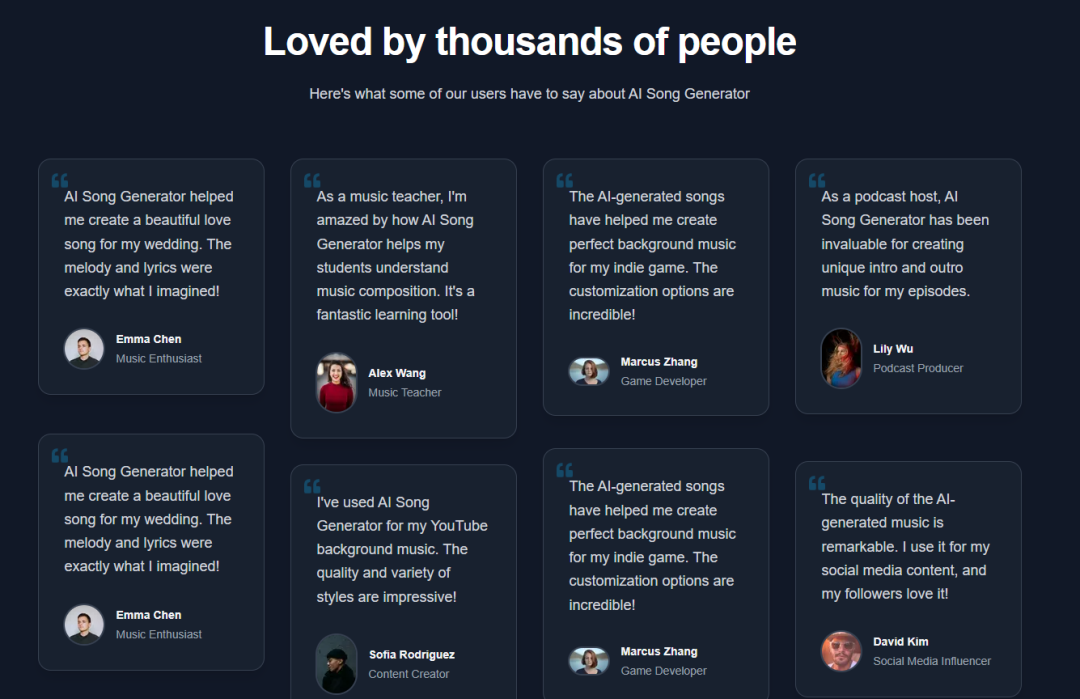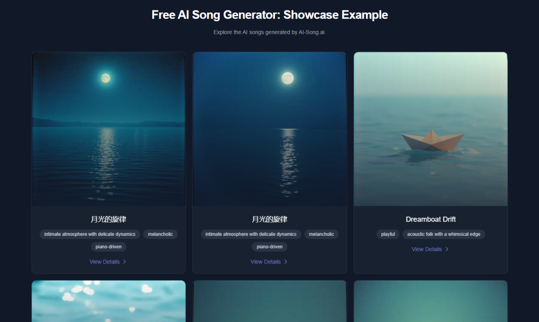 这是一个非常典型的AI作品展示区,目的在于通过实例说服用户,激发使用欲望,并引导其进行深度互动。标题: “Free Al Song Generator: Showcase Example”,再次强调“免费”和“AI生成”的核心价值。“Showcase Example”清晰地告诉用户,这个区域是成功案例的展示,而非操作入口。副标题 “Explore the Al songs generated by Al-Song al.”