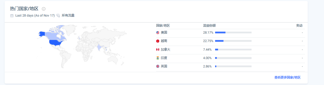 主要流量国家是美国28.17%,越南22.75%,还有加拿大7.44%,再来看下它的主要关键词: