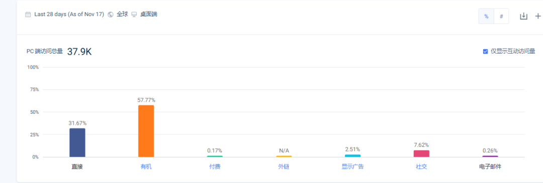 直接流量占比31.67%,自然搜索流量占比57.7%,还有社媒7.62%,主要还是靠SEO来的流量。
