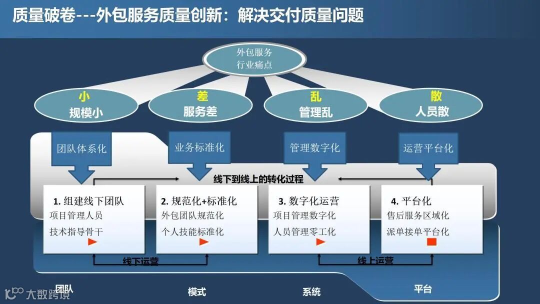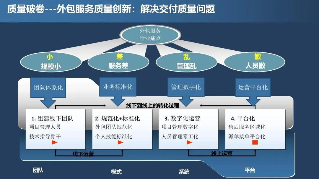 但是,智能装备外包服务行业也面临着规模小、服务差、管理乱、人员散等痛点问题。对于智能装备外包服务商而言,必须从质量、效率、价值等方面破卷。在质量方面,通过团队体系化、业务标准化、管理数字化、运营平台化,解决交付质量问题;在效率方面,通过互联网运营,以更低的成本、更快的效率,找到更好的优质技工和客户;在价值方面,通过职业教育创新,解决价值创造和利润增长问题,最终实现业务实力化。