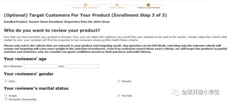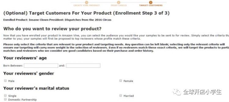 比如,当你在设置Vine Program的时候,你可以设置你想要什么年龄段的,男的还是女的,结婚的还是没结婚的来评价你的商品