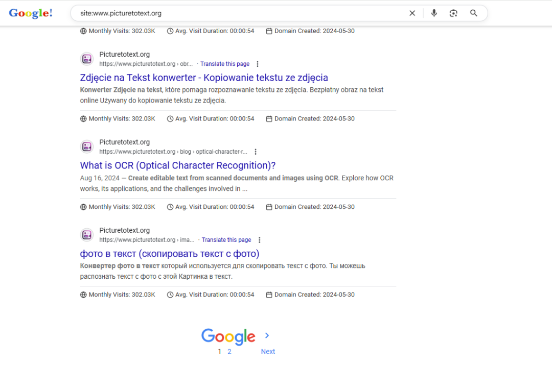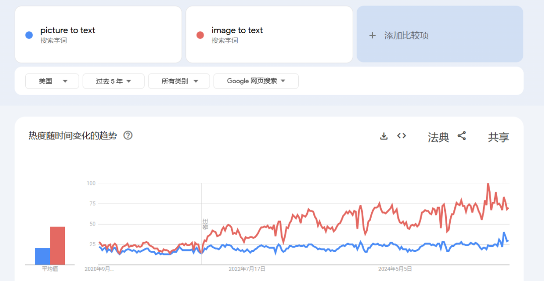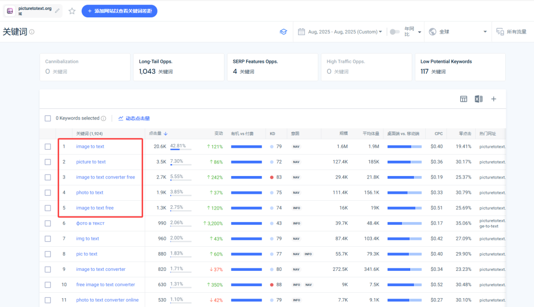 查了一下image to text 和 picture to text的搜索量,一直是image to text搜索量高一些,而且它的域名是picturetotext.org, 盲猜是有可能刚开始做的时候想做稍微简单的 picture to text这个关键词, 首页的TITLE是Picture to Text - Image to Text Converter, 但是没想到误打误撞拿到了搜索量更高的image to text的排名。