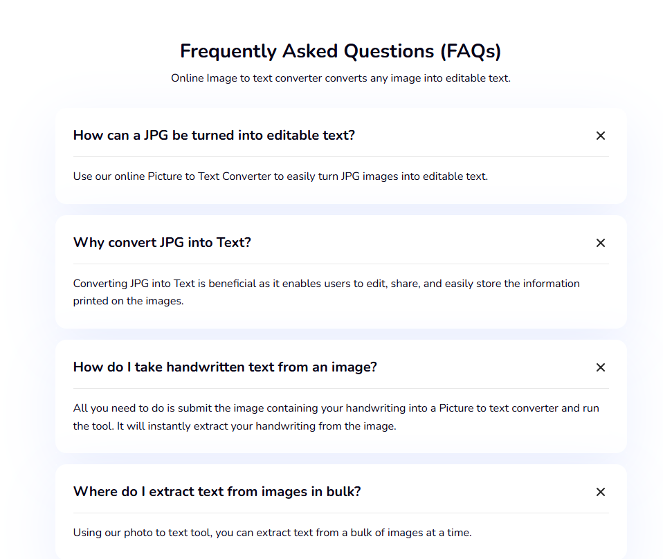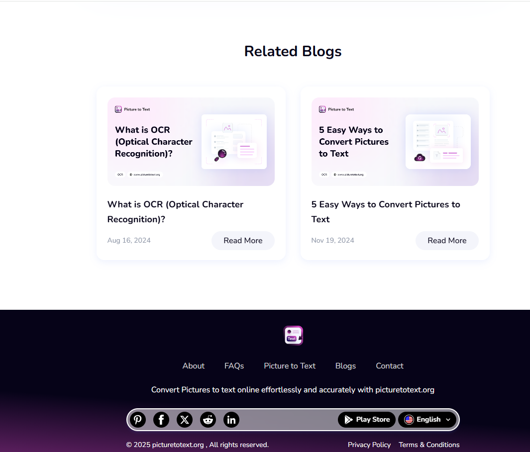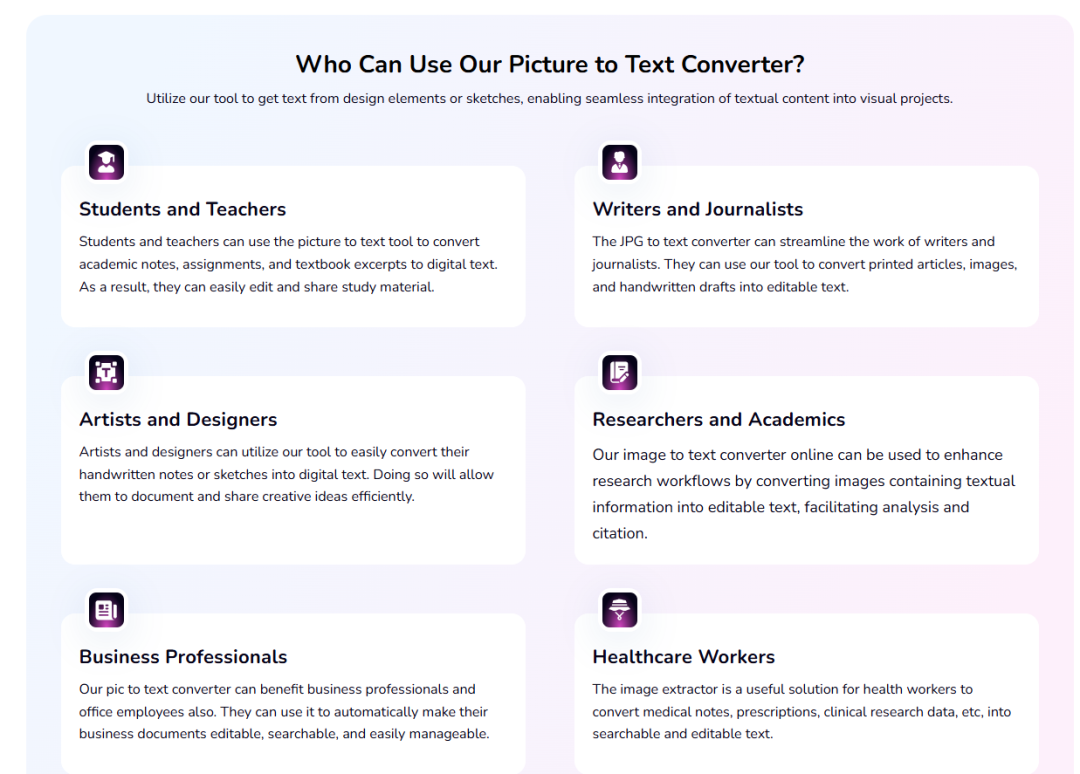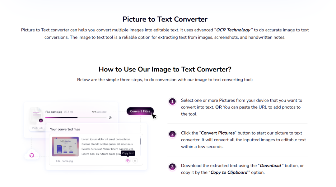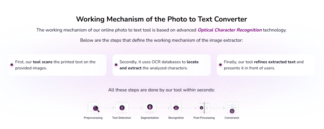 关于核心功能的介绍:这部分在首页的位置比较靠前,紧跟在HERO部分之后,不仅让用户了解网站是如何工作的,还多次自然地出现了核心关键词及其变体,如:“Picture to Text converter”、“image to text conversions”、“image to text tool”、“extracting text from images”。