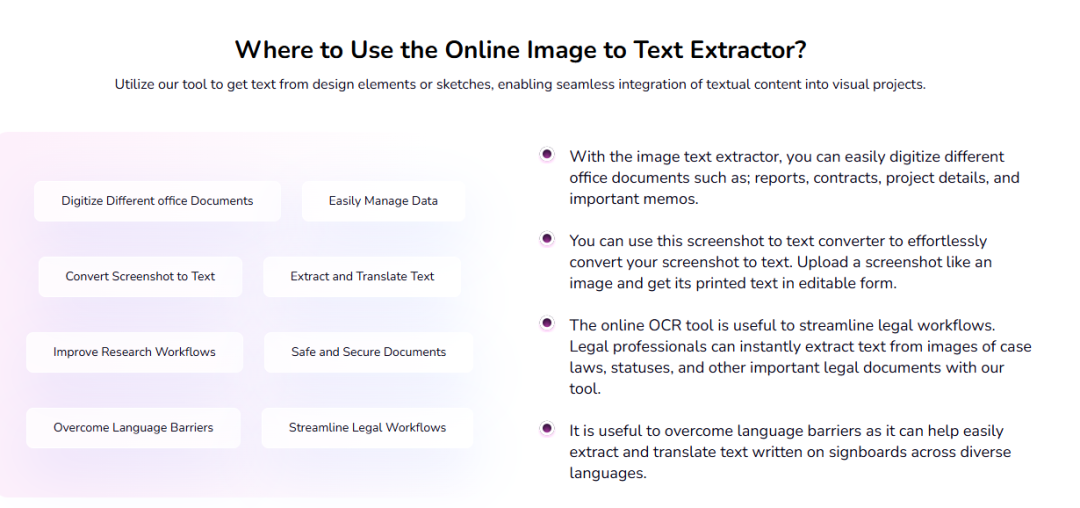 内容提到了办公行政(Digitize Documents)、技术支持(Screenshot to Text)、法律行业(Legal Workflows)和多语言应用(Overcome Language Barriers)等场景。这表明工具具有普适性,能吸引不同行业的用户。