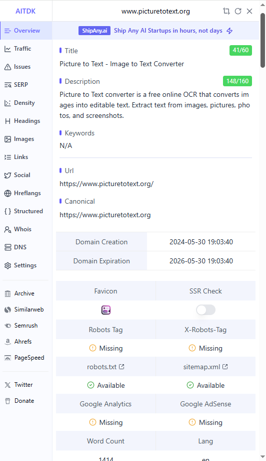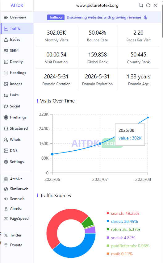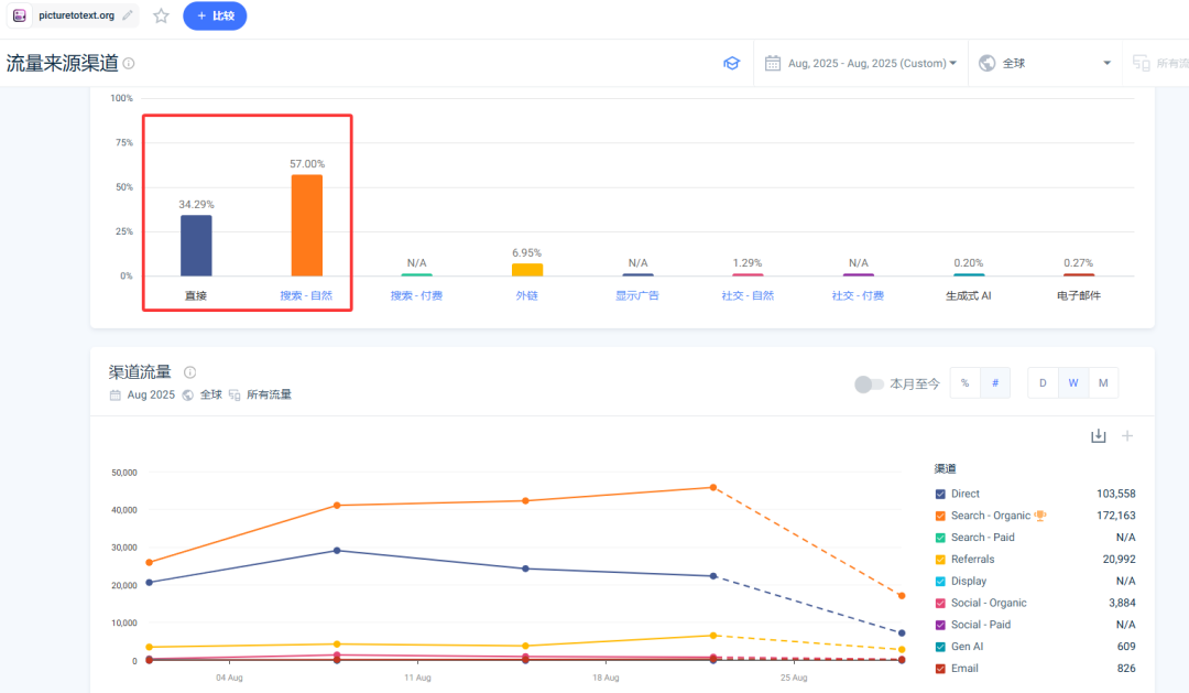 看来image to text这个关键词带来了42%的流量,它网站就两个功能,一个是picture to text, 一个是pdf to text,