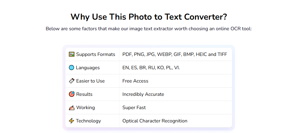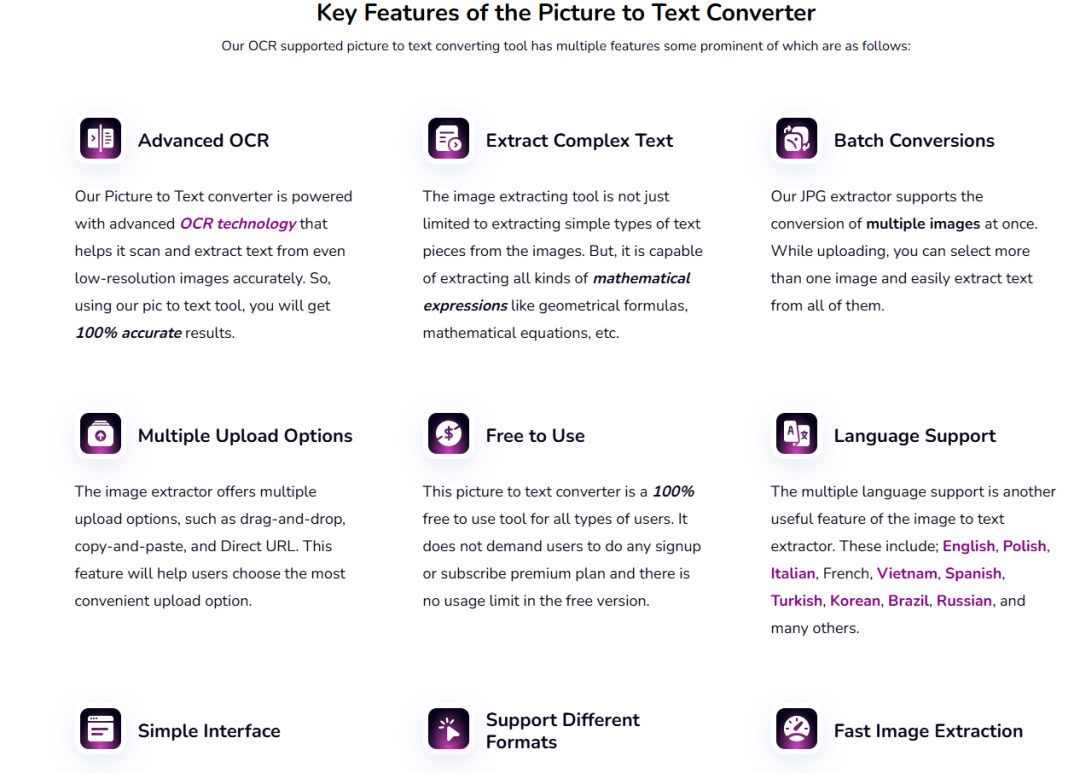 每个功能点(如“Advanced OCR”、“Multiple Upload Options”)都像一个长尾关键词的集合点。内容涵盖了用户决策时关心的多个方面:准确性(Advanced OCR)、便利性(Simple Interface, Multiple Upload Options)、功能性(Extract Complex Text, Batch Conversions)、成本(Free to Use)和适用性(Support Different Formats, Language Support)。不仅让用户对网站有了更清晰的认知,还有助于相关长尾词的排名。