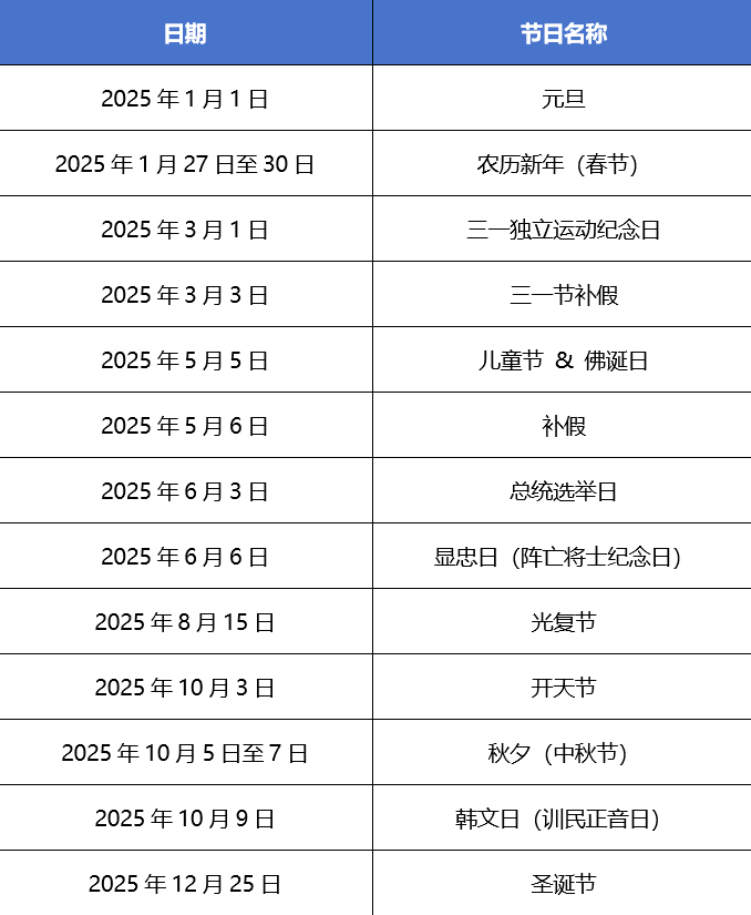 需要注意的是,农历节日与选举日的日期每年不同,建议企业每年查阅官方日历并提前计划排班表。若公众假期恰逢周末,韩国法律不要求企业额外补假。