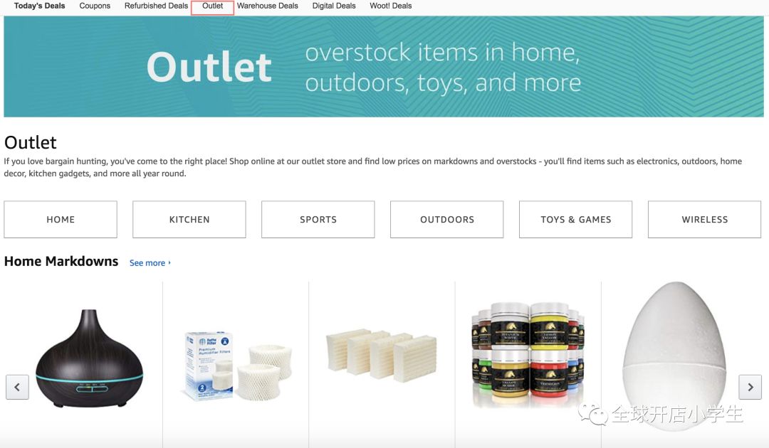 在Amazon.com-点击"Today's Deal"-"Outlet" 就能看到Outlet专属的Deal页面