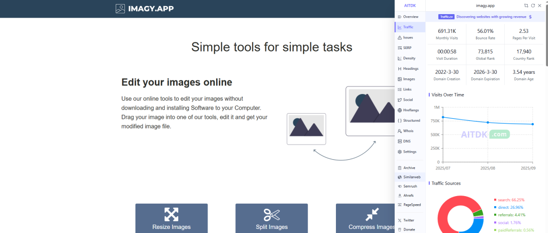 今天我们继续来拆解网站,今天的网站是特别是https://imagy.app/, 还是先看下基本数据: