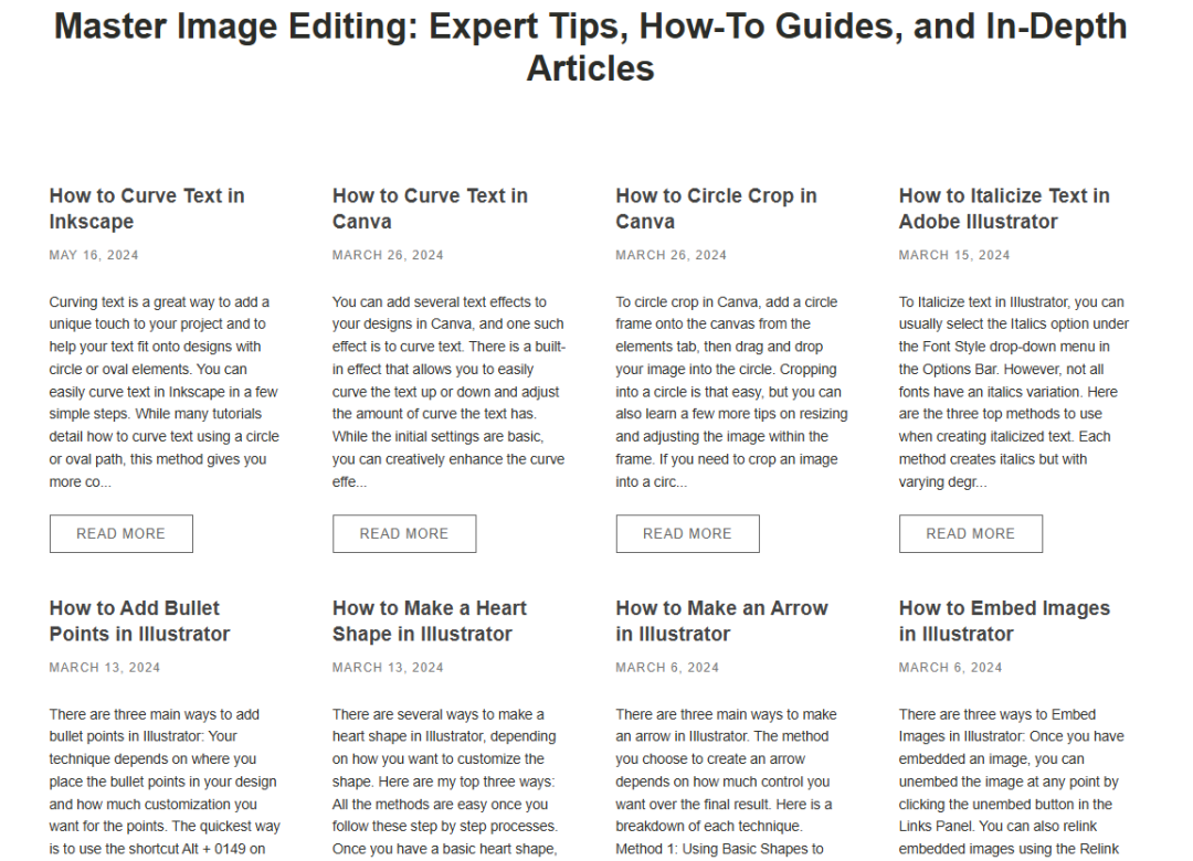 再接下来是文章聚合页面,它的文章标题直接针对用户具体的、高频的搜索意图,例如:“How to Curve Text in Inkscape”:覆盖了“软件+具体操作”的经典搜索模式。“How to Make a Heart Shape in Illustrator”:针对特定形状设计的搜索需求。这些关键词搜索意图明确,转化率高,且竞争难度相对低于“image editing”等宽泛词。