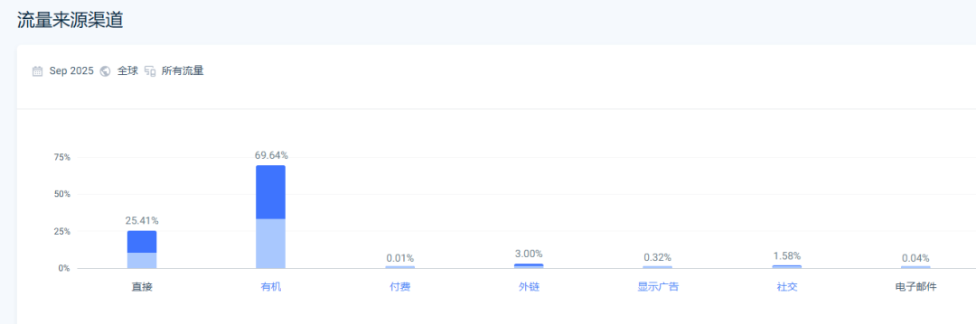 直接流量25%,自然搜索流量快70%,说明它的关键词排名还是比较不错的,主要的关键词如下: