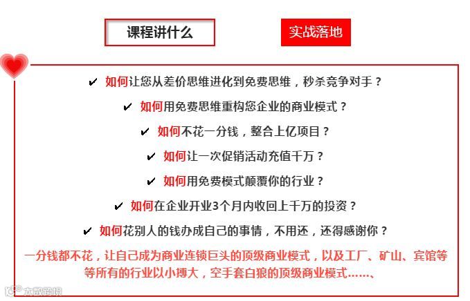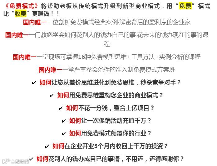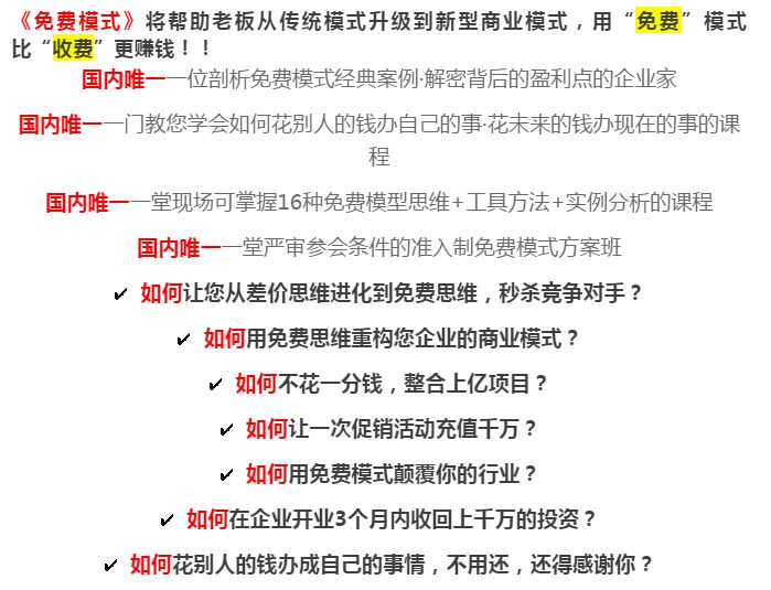 想了解更多的免费模式信息请走进我们线下的课程,两天一夜让您拥有一套不一样的新思维: