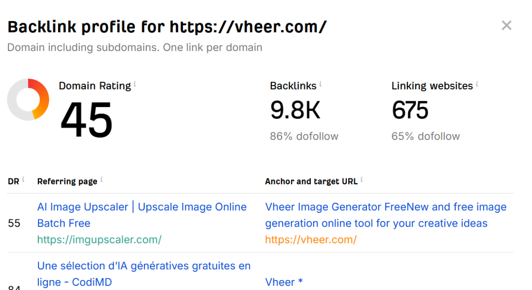 它域名是2014年注册,到现在差不多11年,现在每月流量是200万,平均停留时间是4分15秒,主要关键词除了品牌词外,就是image to video,image to video ai等之类的工具需求词,这种老站一般外链都不少,我们再来看一下外链的数据: