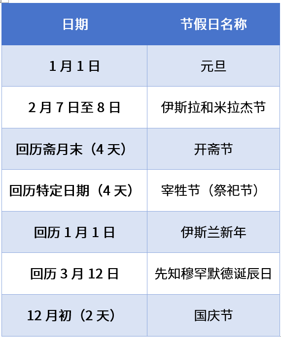 根据阿联酋人力资源与酋长国化部(MOHRE)2025年的官方发布,全年法定公众假期包括: