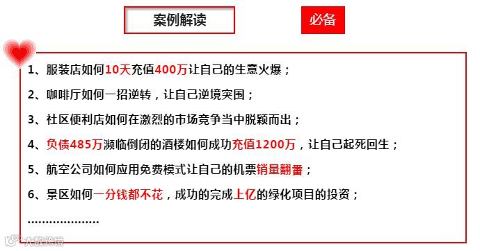 想了解更多的免费模式信息请走进我们线下的课程,两天一夜让您拥有一套不一样的新思维: