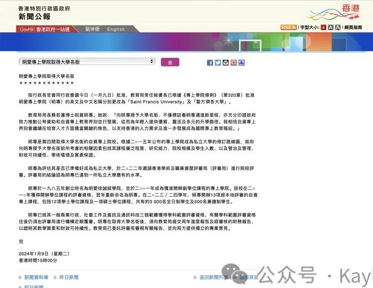 根据香港特区行政长官会同行政会议9日批准,香港特区政府教育局常任秘书长按照《专上学院条例》批准香港明爱专上学院的英文及中文名称分别改为“Saint Francis University”及“圣方济各大学”。