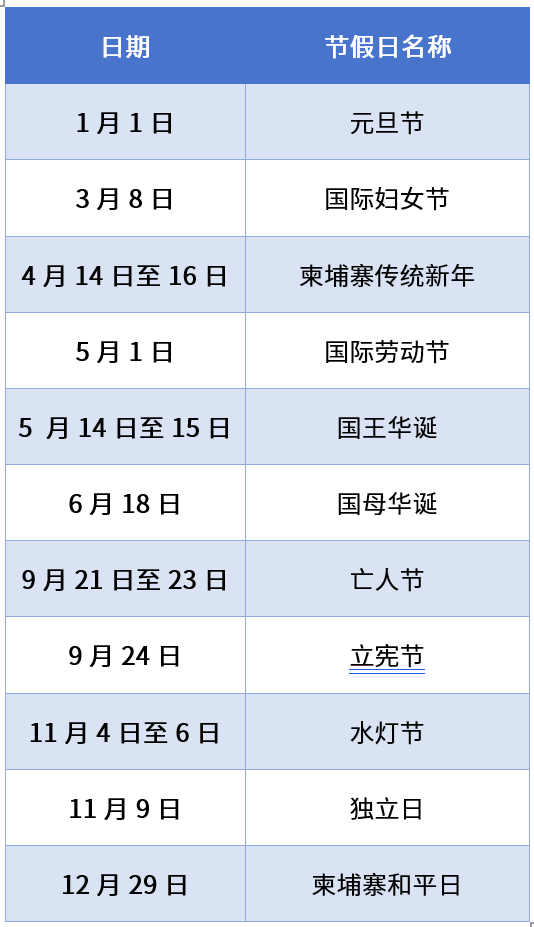 根据官方权威媒体和政府公告,2025年柬埔寨全国法定节假日包括: