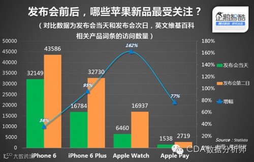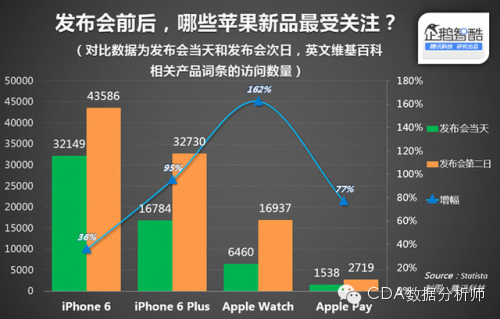 人们对这个初生的设备满是期待。维基百科的访问数据显示,去年9月苹果发布会召开当天和次日,苹果推出的3款硬件新品(2款规格不同的iPhone 6以及1款Apple Watch)的页面访问量都发生了显著变化。其中Apple Watch的访问量从6460次飙升至16937次,增幅达到162%——变化最为明显。