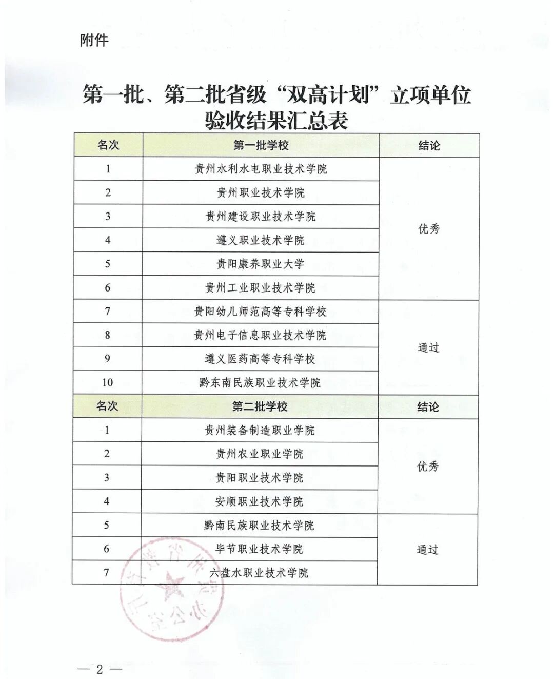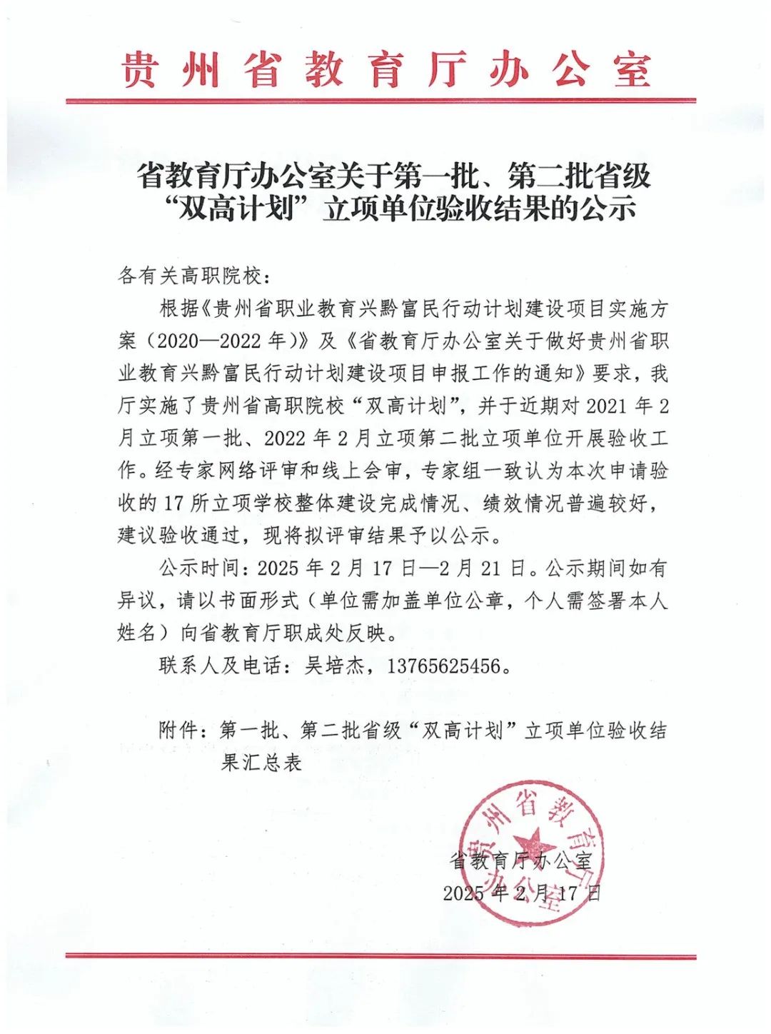 近日,贵州省教育厅办公室发布《关于第一批、第二批省级“双高计划”立项单位验收结果的公示》,共 17 所院校验收通过,其中 10 所院校验收结果为“优秀”。