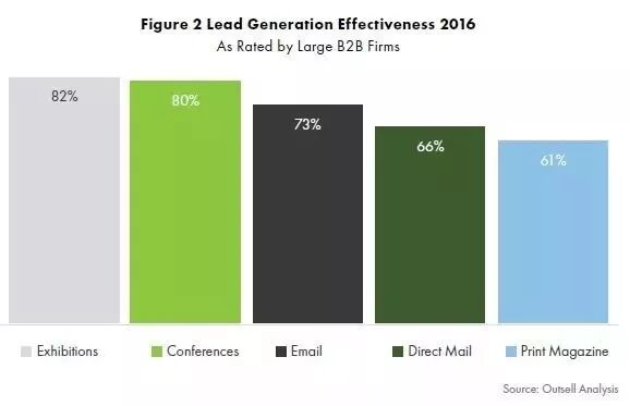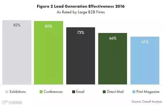 根据 OUTSELL公司2017年发布的Market Size, Share, Forecast & Trend Report(Figure2),展会是国际大型B2B公司接触新客户的最主要的方式,领先于会议和电子邮件。