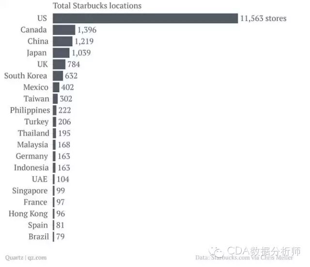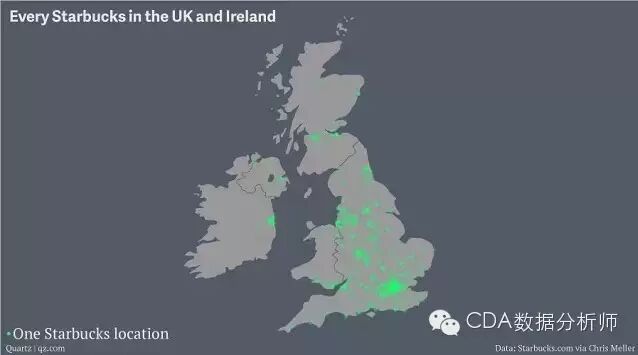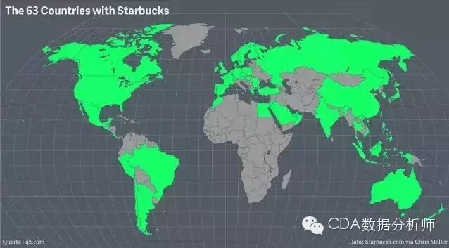 从对星巴克店铺分析的数据可以看到,星巴克从美国西雅图起家到现在已经几乎遍布全球。而Quartz也对星巴克地图做了些分析: