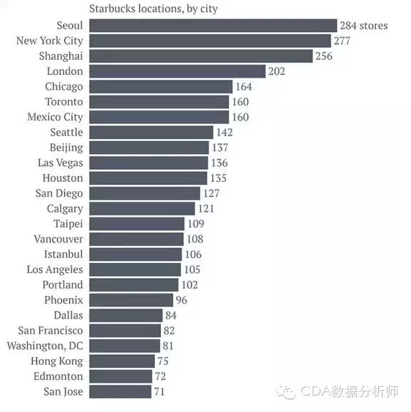 上海有 256 间星巴克,是中国最多星巴克的城市。首尔是全球最多的,有 284 间,比纽约的 277 间还多 7 间。