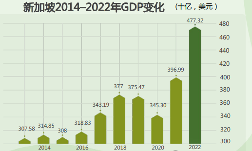 新加坡国土面积不大,但其经济发展却堪称典范,近几十年的经济腾飞,让新加坡逐步占据世界经济与国际贸易的重要位置,成为国际舞台上最闪耀的新星。世界银行(World Bank)数据显示,新加坡2021年的国内生产总值(GDP)为3,969.9亿美元,占世界经济的0.18%1。虽然,近几年疫情的扰动对新加坡的经济造成了不小冲击,2020年GDP下滑明显,但2021年则呈现出爆发式回暖,增长额达7.2%——创10年来新高,代表着新加坡快速从疫情中完成经济修复。在全球经济放缓的大背景下,2022年新加坡GDP打破下滑预测,再创历史新高——新加坡统计局数据显示,2022年GDP达到4,773.2亿美元,该年GDP增长率为3.6%,并有望2023年继续保持均速增长,新加坡经济韧性与可持续性凸显。