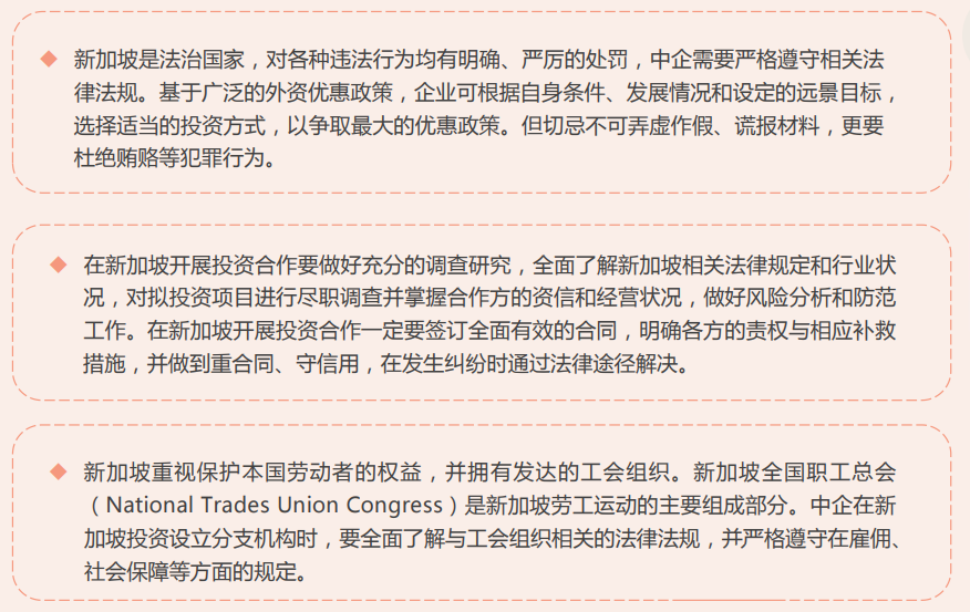 中国企业在进入新加坡市场时,应意识到新加坡不仅是商贸之地,更是中企拓展区域乃至全球业务的中心。新加坡作为一个规则为本的社会,拥有清晰、健全且层次分明的法律和商业体系,为中国企业提供了稳固的增长框架。同时,鉴于新加坡社会的多元化特点,构建多元且包容的企业文化将有助于中国企业在当地取得更好的发展。