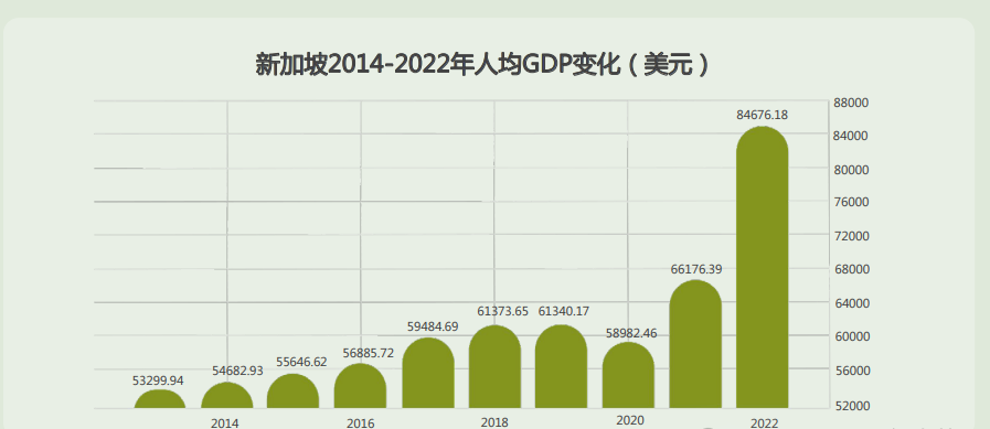 人均GDP(GDP Per Capital)是衡量国家宏观经济的重要指标,根据世界银行(WorldBank)数据呈现结果,新加坡2021年人均国内生产总值高达66,176.39 美元——其人均GDP相当于世界平均水平的524% ,代表着新加坡的综合国力和经济规模远超东南亚其他国家,处于世界领先水平。而根据新加坡统计局最新公布的2022年GDP数据,新加坡人均GDP再度大幅抬升突破8万美元——2022年人均GDP达84,676.18美元。