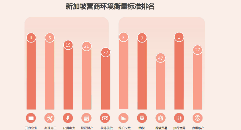 新加坡凭借优越的地理位置、先进的基础设施、高素质人才、低税率、健全制度及高效廉洁政府,拥有高度发达的市场经济体系,成为世界上最具竞争力的经济体之一,获得世界经济论坛和IMD等机构的高度评价。根据世界银行《2020年营商环境报告》,新加坡在全球190个经济体中营商便利度排名第2,与榜首差距缩小,显示其营商环境持续优化。