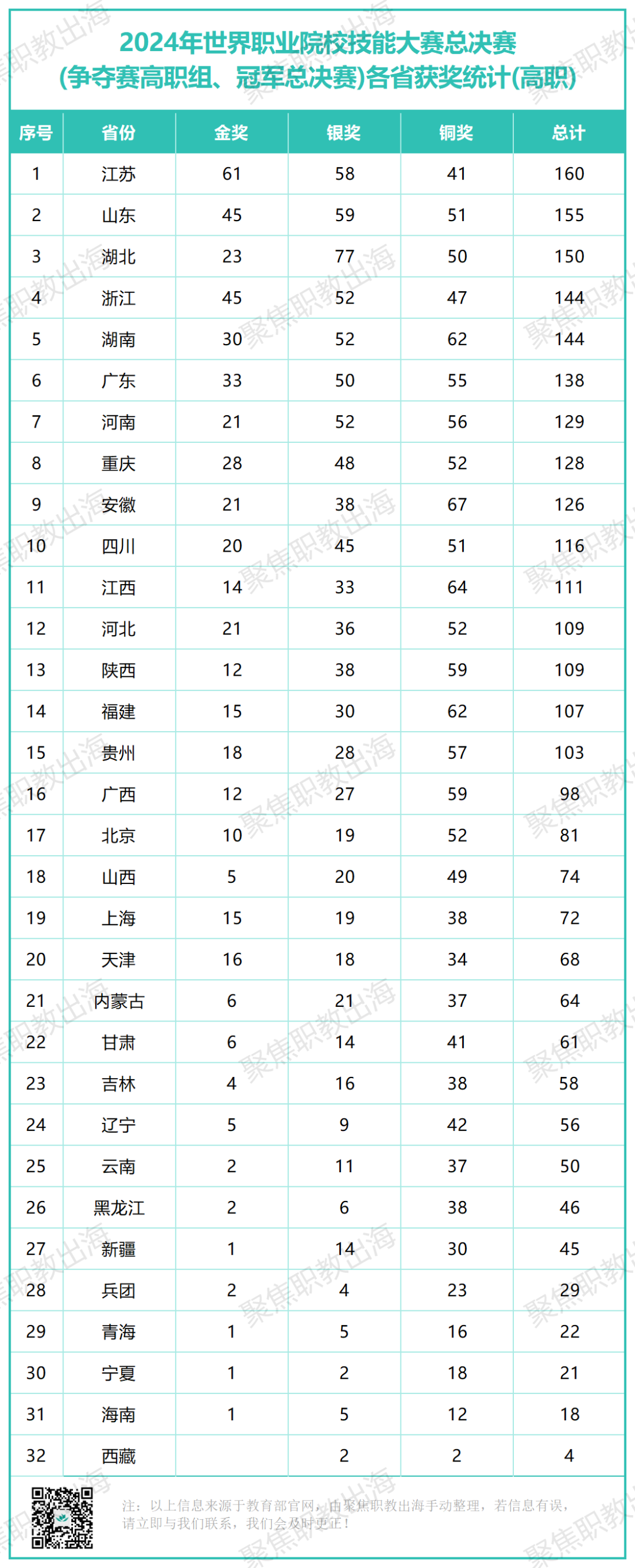 根据争夺赛高职组和冠军总决赛获奖名单统计,江苏省高职院校共获奖160项,获奖总数位居全国第一,其中获金奖61项,银奖58项,铜奖41项。山东省高职院校共获奖155项,获奖总数位居全国第二湖北省高职院校共获奖150项,获奖总数位居全国第三。各省高职院校获奖情况如下: