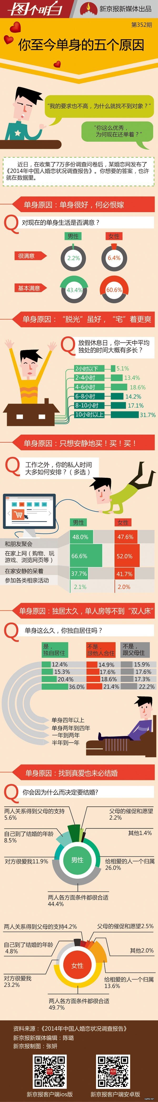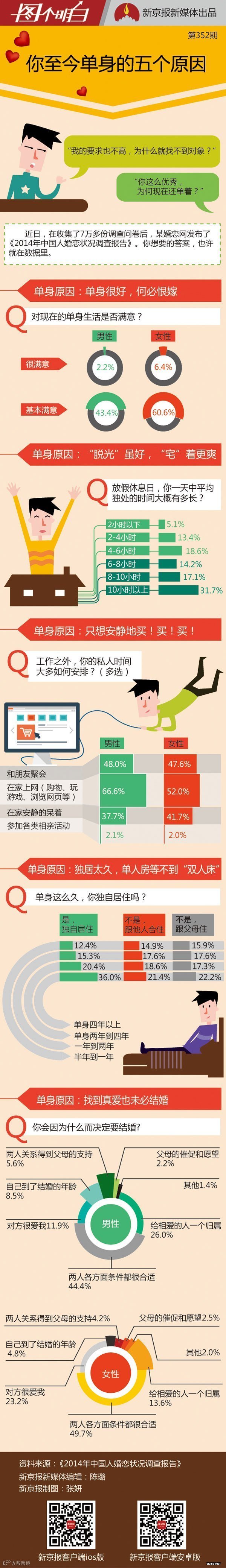 “我的要求也不高,为什么就找不到对象?” “你这么优秀,为何现在还单着?”近日,在收集了7万多份调查问卷后,某婚恋网发布了《2014年中国人婚恋状况调查报告》。你想要的答案,也许就在数据里。