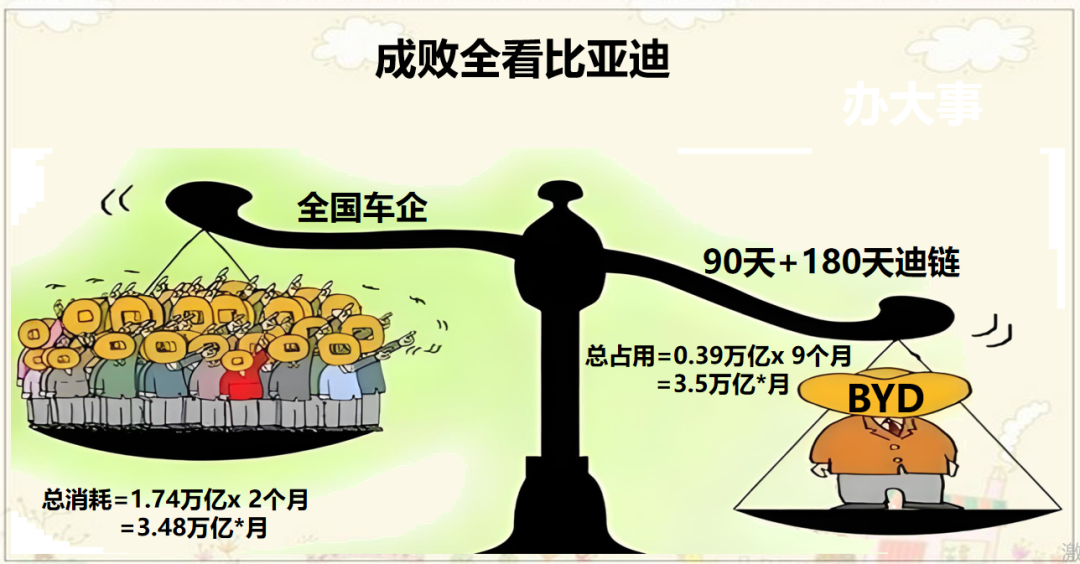 去年17家车企销售量大约2900万台,假定每台车出厂价12万元(实际零售给用户的不止这个数,算上经销商利润和政府补贴是挂牌零售价是14-15万元,这个价格假设是合理的),总营收3.48万亿,需支付供应商费用大约1.74万亿(一般按照50%计算)如果账期按照2个月计算,1.74万亿*2个月=3.48万亿*月,这个金额正好略低于比亚迪2024年占用供应商资金资源的3.5万亿*月--3890亿*(3+6)月=3.5万亿*月。