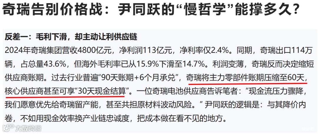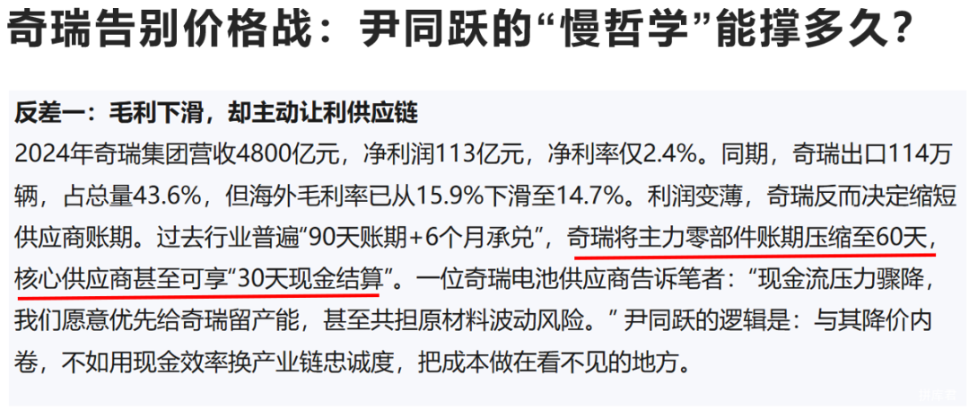 根据懂车帝7月20日的报道,奇瑞已经将主力供应商账期压缩至60天,核心供应商可享“30天结算”