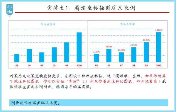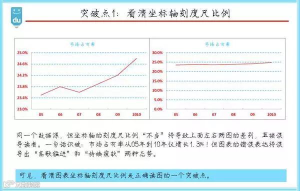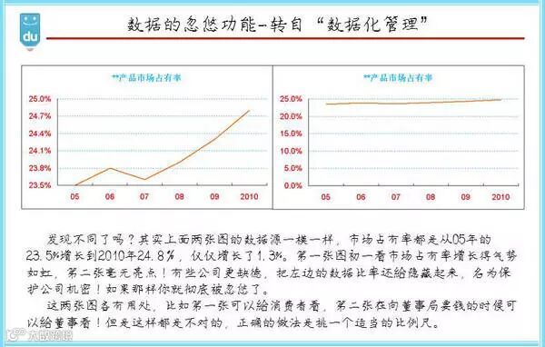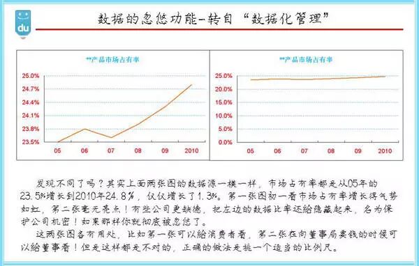 数据化管理有一篇博客非常精彩,“数据的忽悠功能”。如上图所示,左右两张市场占有率线图,发现不同了么?数据源是一样的,占有率都是05年到10你那增加1.3%。第一张图乍一看市场占有率气势如虹,第二张却毫无亮点。是不是被忽悠到了?