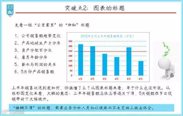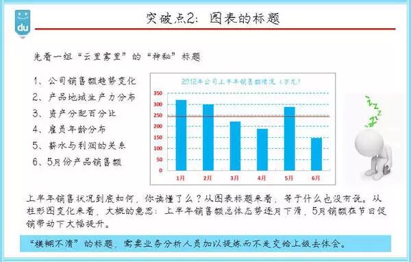 “公司销售额趋势变化”,“产品地狱生产力分布”“资产分配占比”“雇员年龄分布”等等这样的标题,读后雨里雾里一无所获,趋势是什么?如何分布的?关系是什么?为什么不考虑直接报这层结果作为标题呢?