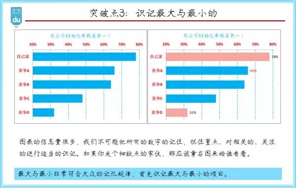 一张图表往往含有大量的信息,大量的数字,读者您能记住多少呢?我建议,识记最大的和最小的项目,或者与你有关的数字,比如,你部门的,你负责的。