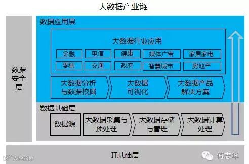大数据的产业链从整体上可以分为四大层,包括IT基础层、数据基础层、数据应用层和数据安全层。个人认为在中国市场对于创业者来说,数据应用层的创业机会最多,想象空间也最大。