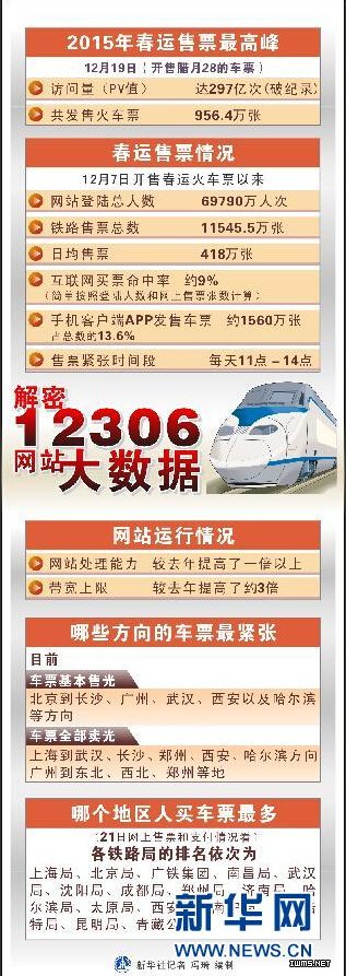 2015年春运火车票售卖的最高峰一天出现在12月19日,当天开售腊月28的车票(2月16日)。12306网站访问量(PV值)达到破纪录的297亿次。当天共发售火车票956.4万张,其中互联网发售563.9万张,占比59%,均创历年新高。