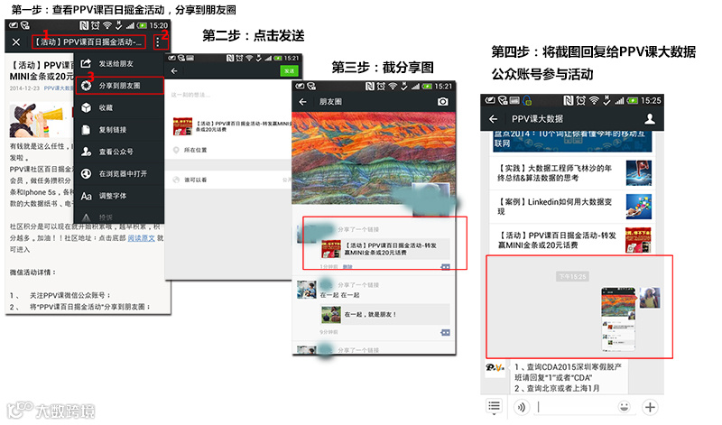 备注:一定要把分享活动截图回复到PPV课公众账号哦,这可是抽奖的凭证哦!次日发布前一日中奖信息。每日中奖人员会以微信通知,活动后统一公布中奖名单。微信中奖礼品:MINI金条和20元手机充值卡,随机赠送哦!