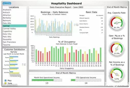 提供一个全局的展现,当然也不是只是一个理念就能解决的问题。如果我们想把大量的数据集成在一个界面,不需任何切换就可以观察,就需要相应的软件支持。比如子弹图,Sparkline等等工具。在这里就不详细描述了。
