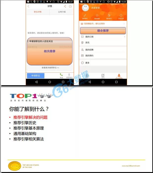58同城是中国本地生活服务应用的代表。从最新数据规模上看,58同城已经超过了美国的Graigslist成为该领域世界第一,拥有超过1.3亿的月独立用户和400多万的季度活跃本地商户,月度发布超过5600万条本地生活服务信息。更复杂的是,58同城覆盖了诸如招聘、二手、二手车、房产等几乎所有垂直生活服务领域,所以数据类型非常异构多样。本案例将介绍在这样一个海量异构的数据源上,如何构建一个满足全领域需求的个性化推荐引擎。