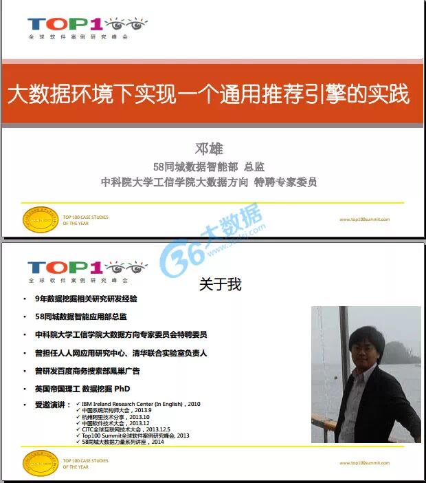 本PPT来自58同城数据智能部总监邓雄,英国帝国理工数据挖掘博士。他长期从事推荐引擎、社交图谱及兴趣图谱挖掘、计算广告等方面深入研发工作,是大数据挖掘和智能系统的资深专家。他目前全面负责58同城大数据智能分析和挖掘的建设。曾担任人人网应用研究中心负责人,兼任人人网清华联合实验室负责人,总体负责人人网社交网络中社交关系链挖掘、好友推荐、兴趣偏好及热点趋势挖掘、图像处理和识别的研发工作。曾从事百度商务搜索部凤巢广告系统研发。他擅长产品技术创新,目前拥有10多个相关专利。他是中科院大学工程与信息技术学院大数据方向专家委员会特聘委员。